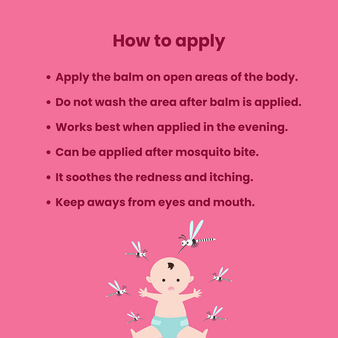 - To use, simply apply a small amount of the balm to your baby’s exposed skin, such as the face, arms, and legs. Gently massage it in with circular motions. It’s easy to apply and absorbs quickly, providing immediate protection from mosquitoes and other insects. - Is this balm safe for everyday use?