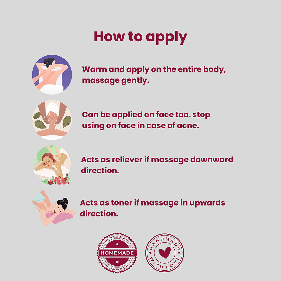 Must be used after delivery for mother, at least for 40 days. Suitable for all seasons. Helps in toning and improving skin dryness as well as muscle relaxation.