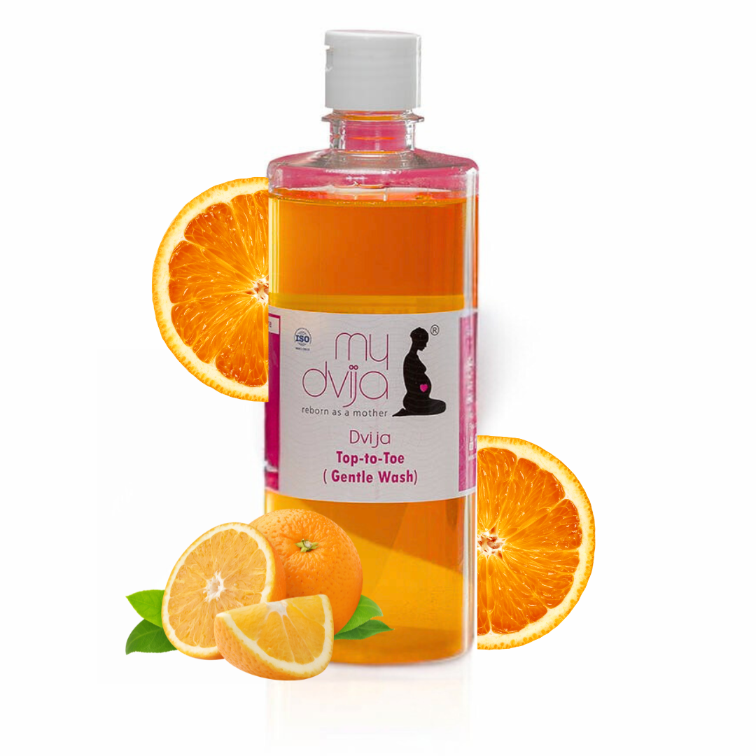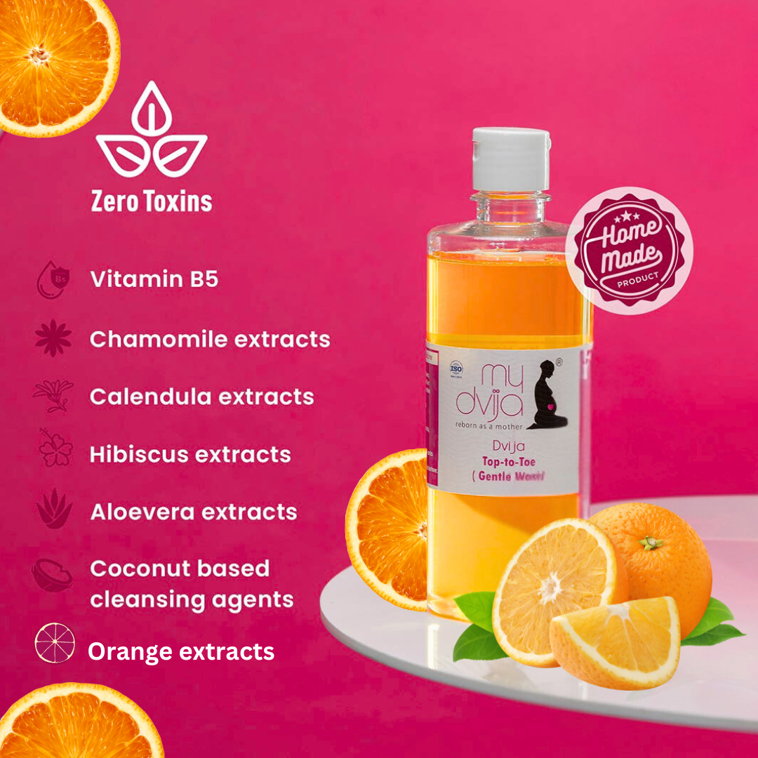 Natural Ingredients: MyDvija Top-to-Toe Baby Wash is formulated with a blend of natural elements, including Pro Vitamin B5, chamomile extracts, calendula extracts,Orange extracts, hibiscus extracts, aloe vera extracts, and coconut-based cleansing agents. These ingredients are known for their nourishing and calming properties, making them perfect for sensitive skin.